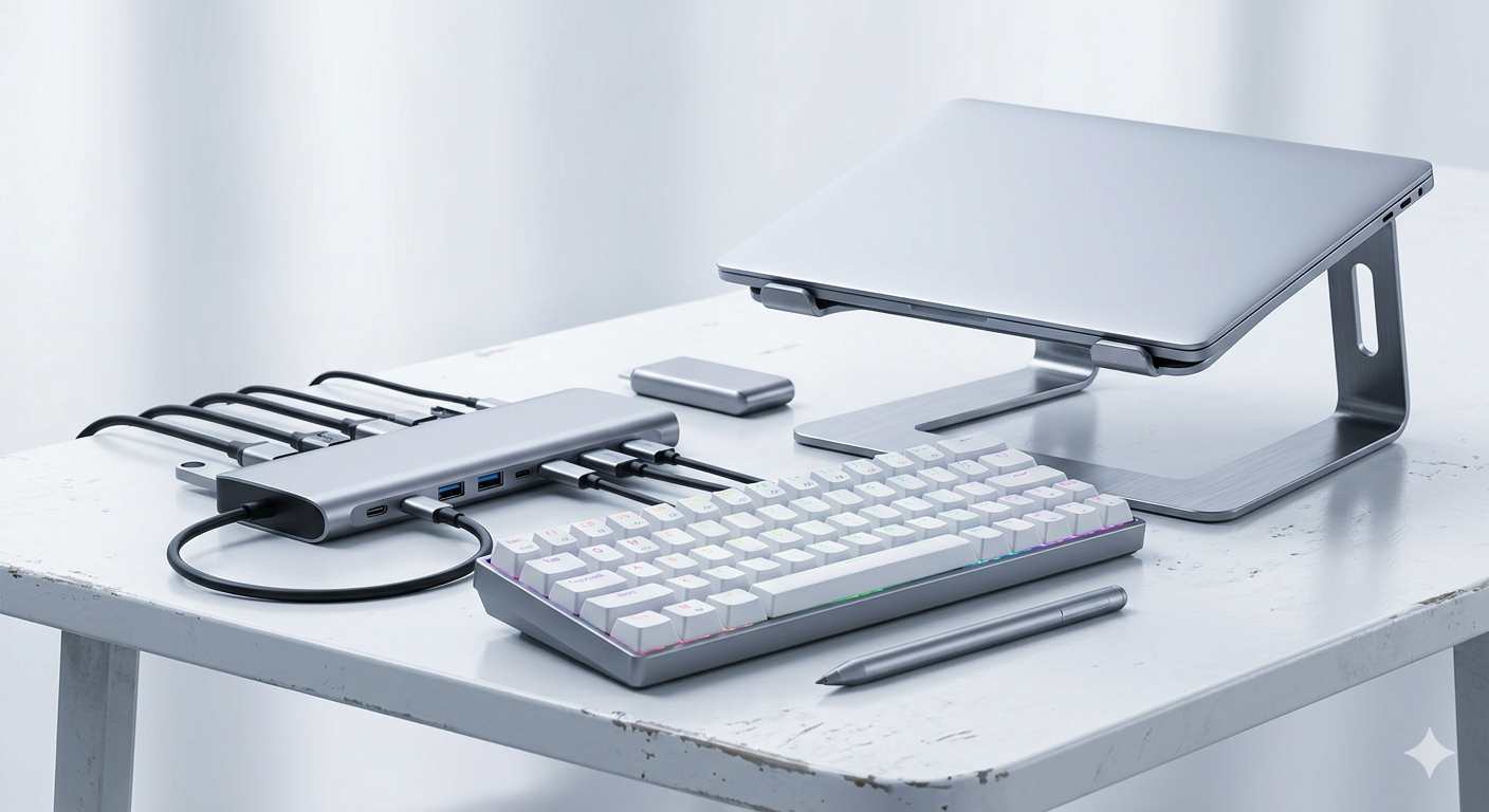 多功能 USB-C 擴充塢、人體工學鍵盤、電容筆。USB-C hubs, ergonomic keyboards, and styluses.