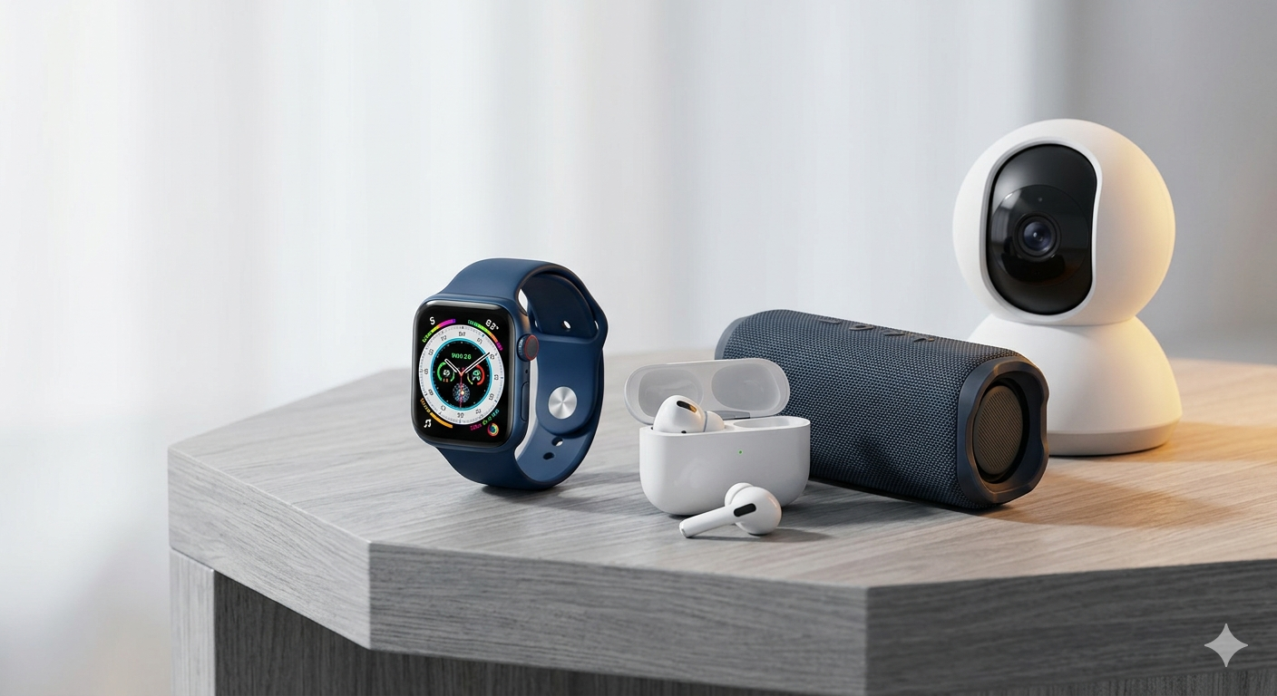 主動降噪耳機、智能手錶及家用監控設備。ANC headphones, smartwatches, and security cams.