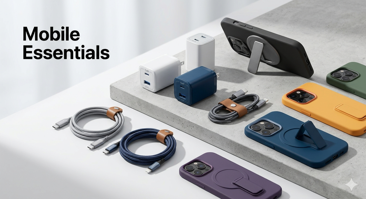 氮化鎵 GaN 充電器、高速數據線、磁吸保護殼等。GaN chargers, high-speed cables, and magnetic cases.